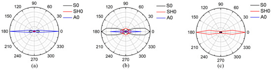Figure 3 shows simulation results of the directivity of guided waves excited by line sources. For waves excited by the normal loading, the SH0 wave is much weaker than the A0 wave, which can be found in Figure 3a. Similarly, for waves excited by tangential shear loading, the SH0 wave is significantly weaker than the S0 wave, as shown in Figure 3b. However, for waves excited by the anti-plane shear loading, the SH0 wave is stronger than the Lamb waves. In this case, the Lamb waves can be ignored, which is plotted in Figure 3c, and the SH0 wave is perpendicular to the line source with a narrow beam. Therefore, the anti-plane shear loading shows an excellent ability to excite the SH0 wave.
