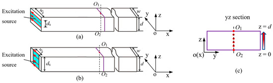 The anti-plane shear loading can be easily loaded at the end of a waveguide bar [20,25]. In order to investigate whether the change of excitation source affects the waveform, the waves from the part surface of the waveguide bar are excited gradually to the whole surface. The representative loading methods are shown in Figure 4. The highlighted area denotes the excitation source. The width of a waveguide bar is w, and the thickness is d. The width of the excitation source is named as ws, and the thickness is ds.
