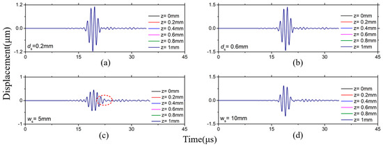 When fd are smaller than (fd)1, a 1 mm-thick waveguide bar and a 0.5 mm-thick waveguide bar are analyzed. Figure 5 shows the waveform of waves excited by the excitation sources with different matching styles in a 1 mm thick waveguide bar. The wave signals excited by the EWS are shown in Figure 5a,b, and the signals excited by the ETS are depicted in Figure 5c,d. It is noticed that the signals don’t change when the thickness of the excitation source changes from 0.2 mm to 1 mm. According to the group velocity and the wave structure of SH0* wave, it is easy to know that the wave excited in the waveguide bar is the SH0* wave. This shows that no matter how thick the excitation source is, the non-dispersive SH0* wave can always be excited in the waveguide bar. And the wave slightly disperses when ws is 5 mm, as shown in Figure 5c. Moreover, the wave dispersion weakens with the increase of the excitation source’s width and the wave dispersion can be ignored when ws is bigger than 9 mm, as shown in Figure 5d. The same conclusion can be obtained when the simulation is carried out using a 0.5 mm thick waveguide bar. Therefore, 9 mm is a critical width value.