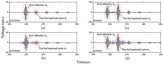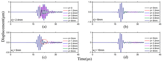 Waveforms in 6 mm thick waveguide bars: (a) ws = 25 mm, ds = 2.4 mm; (b) ws = 25 mm, ds = 6 mm; (c) ws = 5 mm, ds = 6 mm; (d) ws = 10 mm, ds = 6 mm.