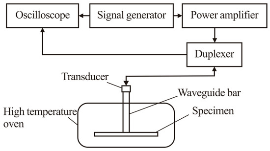 The experimental system is setup as shown in Figure 7, which is composed of oscilloscope MDO3012 (Tektronix, INC., Beaverton, OR, USA), function generator AFG 3021C(Tektronix, INC., Beaverton, OR, USA), power amplifier AG1006 (T&C Power Conversion, INC., Rochester, NY, USA), duplexer (Ritec, INC., Warwick, RI, USA), piezoelectric transducer (Olympus V154-RM, Olympus NDT, INC., Waltham, MA, USA), waveguide bars, specimen plate, related clamps and a high temperature oven. The waveguide bars and the specimen plate are all 316L stainless steel. The dimensions of the test plate is 150 mm × 150 mm × 10 mm. The 316L stainless steel bars are attached to the specimen by a specific clamp, so that the clamping forces attached on each waveguide bar are constant. The specimen is placed in the oven. One end of the waveguide bar is mounted on the test plate and the other end passes through the thermal insulation layer staying outside of the oven.