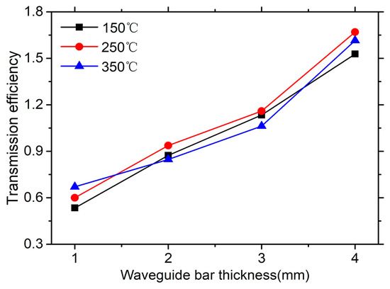 Curves of the transmission efficiency η versus thickness are shown in Figure 9. They monotonically increase. These curves shows that the thicker the waveguide is, the more energy of the SH0* wave is transferred into the test plate for damage detection. Moreover, the effect of temperature change on the transmission efficiency can be neglected.