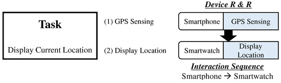 Concept 2 (Cross-Device Computation Coordination). We define a concept of cross-device computation coordination (XDCC) as a means of sharing and integrating information and resources between the connected devices in MCI so that each device can accomplish their part in support of a mutual objective of completing a task. Most suitable target tasks for XDCC are tasks that require real-time, computationally heavy and energy-consuming processes. A typical example includes machine learning applications (i.e., text recognition, face detection, marker tracking and gesture recognition) and sensor-based data processing. For example, to display current location on a smartwatch application, GPS signals received in a smartphone can be shared with a paired smartwatch. To perform XDCC, we need to specify roles and responsibilities (R & R) of each device as well as a particular interaction sequence between devices as illustrated in Figure 2.
