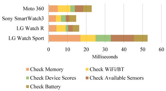 We developed and implemented a suite of CDP to obtain static and dynamic context (cf. Section 3.2) of the 12 devices. In our first experiment, we measured the time for our CDP method on various devices. We analyzed current statuses and usages of the devices in terms of memory, communication facilities, retrieving benchmark scores, sensors and battery. Figure 4 and Figure 5 show processing time required for running the suite of CDP on smartphones and smartwatches, respectively. On most devices, this CDP process took less than 25 ms (on 11 out of 12 devices). Implementation details for running this experiment using Android and Wear OS are presented.