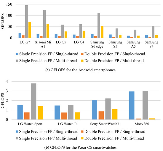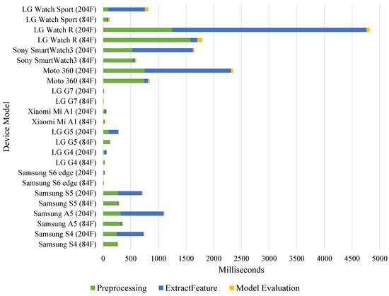 Figure 7 shows TTM for preprocessing, feature extraction and model evaluation on Android smartphones and Wear OS smartwatches. When 84 features were extracted, all smartphones completed machine learning processes under 500 ms. However, when more demanding FFT features were included in 204 features, task time increased on all devices as shown in Figure 7.
