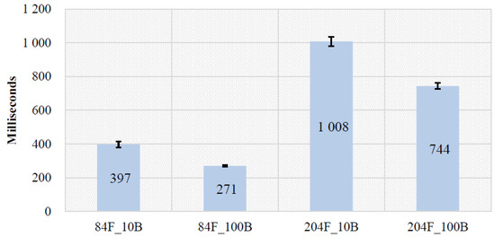 We also examined effects of low battery in TTM to demonstrate that the sensed on-device context (i.e., battery status) can be used as a performance indicator for the XDCC problem. We used two devices that have low scores on AnTuTu and VFP benchmarks, including one smartphone (Samsung S4) and one smartwatch (Moto 360). The same task (cf. Section 4.2) is used for this experiment as well. For each device, fully charged (100% denoted as 100B) and low-battery (10–15% denoted as 10B and 15B) conditions were tested for two feature sets (84 features denoted as 84F and 204 features denoted as 204F). Figure 8 and Figure 9 show total processing time on Samsung S4 and Moto 360 for different battery conditions, respectively.