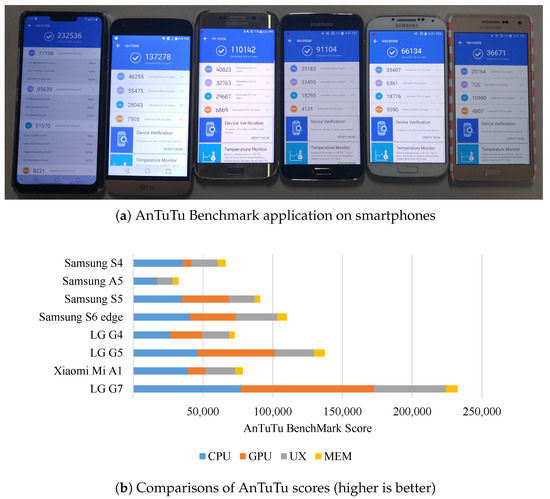 Third, previously measured benchmarking scores can be used to estimate performances of other mobile device, wearables and IoTs within similar ranges. For example, Samsung S4 and Samsung S5 have VFP scores within similar ranges, and their performance on machine learning processes also fall into the similar ranges (204 features, S4: 743 ms, S5: 713 ms and 84 features S4: 270 ms, S5: 291 ms). Similarly, we can infer that Samsung Note9 and Samsung S9 have comparable performance with LG G7, since they have similar AnTuTu scores shown in Table 3. So, if we only have AnTuTu or VFP scores, we can use benchmark scores as side information for backtracking and estimating performance on tasks of interest.
