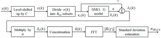 - For each subset , obtain the estimate of , , by the GM(1,1) model described in Section 3.1. Then, is considered as the estimate of , , that is, . Finally, calculate the estimation error of GM(1,1) model as .