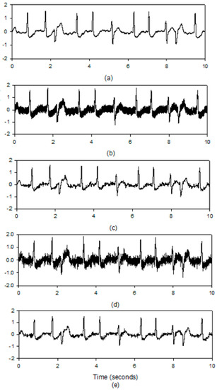 - Liu, S.-H. Motion artifact reduction in electrocardiogram using adaptive filter. J. Med Biol. Eng. 2011, 31, 67–72. [Google Scholar] [CrossRef]