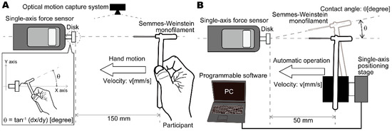 In the first experiment, we measured the human hand motion in the monofilament test using an optical motion capture system (Natural Point Co., LTD., OptiTrack V120:Trio, Corvallis, OR, USA). We calculated and compared the velocity of each participant’s hand motion and the contact angle of the monofilament. In the second experiment, we measured the buckling force of the monofilament using an automated positioning stage with a precision motor (SIGMA KOKI Co., LTD., HPS60-20X, Tokyo, Japan). Figure 1 shows the measurement apparatus setup. In experiment 1, the force sensor was mounted on a disk substituting for the skin surface, 150 mm left of the center position of the participant’s hand (see Figure 1A). In experiment 2, the force sensor was mounted on a disk 50 mm left of the center position of the monofilament (see Figure 1B).