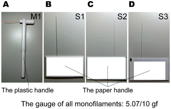 Four 5.07/10 gf monofilaments were used, comprising one multi-use monofilament (denoted M1) and three single-use monofilaments (denoted S1, S2, and S3) (see Figure 2). The monofilaments were each moved using a single-axis positioning stage (SIGMA KOKI Co., LTD., HPS60-20X, Tokyo, Japan) controlled by a precision stepping motor with a pulse driver unit using a PC with programmable software installed (National Instruments Co., LTD., LabVIEW, Austin, TX, USA) (see Figure 1B). The force sensor collected data at a rate of 100 samples per second (a 100 Hz sampling frequency) during each task.