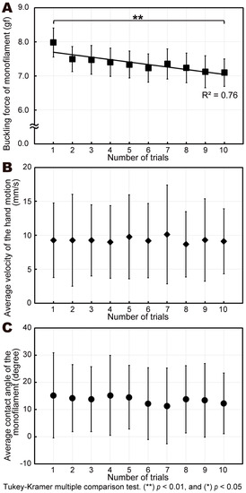 We measured the human hand motion with a monofilament, simulating the SWMT used in clinical practice. As shown in Figure 3, the average buckling force of the first compression for all participants was 8.0 gf; specifically, it was 7.1 gf for the tenth compression, and the average for all 10 trials was 7.4 ± 0.5 gf. The buckling force over the 10 compressions decreased by over 10%. The correlation coefficient (R2) between the buckling force and the number of trials was 0.76, indicating that the buckling force correlates closely with the number of compressions. There were significant differences between the first and tenth trials (p < 0.01) (see Figure 3A), which explains why the decrease in the buckling force correlated closely with the number of compressions. The SWMT must consider that the buckling force decreased after the first compression trial. The average velocity of the hand motion and the average contact angle for all participants were 9.3 ± 5.7 mm/s and 13.6 ± 12.9 °, respectively (see Figure 3B,C). When the SWMT was performed under manual control, the buckling force was closely correlated with the number of compressions.