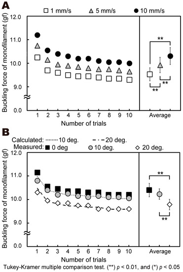 The statistical significance of the observed monofilament buckling force differences obtained following the various experimental trials was determined by one-way analysis of variance (ANOVA). For multiple comparisons of the differences between the different number of trials, the Tukey–Kramer test at levels 0.01 and 0.05 was used.