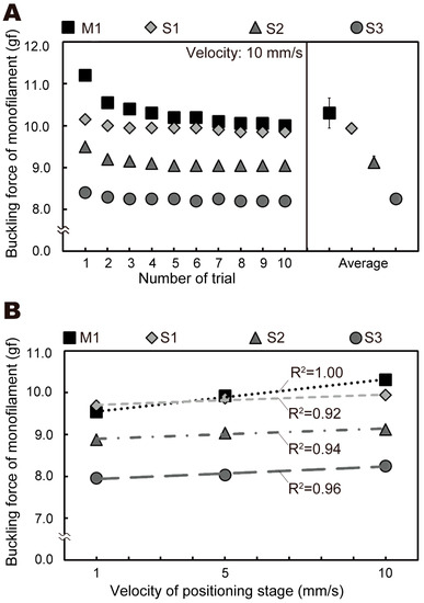 Finally, we compared the buckling force in a number of trials for other monofilaments, as shown in Figure 5. When the positioning stage velocity was 10 mm/s, the buckling force of the multi-use monofilament (M1) for the first compression was 11.2 gf, compared to 10.0 gf for the tenth trial. The buckling force of the single-use monofilament (S1) for the first and tenth trials was 10.1 gf and 9.8 gf, respectively. The average buckling force across all compressions was 10.3 ± 0.4 gf for M1, compared to 9.9 ± 0.1 gf for S1, 9.1 ± 0.1 gf for S2, and 8.2 ± 0.0 gf for S3 (see Figure 5A). Then, we compared the buckling force in the velocity of the positioning stage for all monofilaments, as shown in Figure 5B. The correlation coefficient (R2) between the buckling force of the multi-use monofilament (M1) and the number of trials was 1.00 (black markers), which indicates that the buckling force correlates closely with the number of compressions. The correlation coefficient (R2) between the buckling force of the three single-use monofilaments for S1, S2, and S3 and the number of trials was 0.92, 0.94, and 0.96, respectively. Hence, all the monofilaments correlated with the compression velocity.