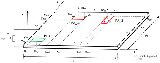 The whole plate with integrated piezoceramic patches is excited to vibration by bending moment Mx(x,y) or My(x,y) at the position of both actuators. The perfectly bonded actuators have the same length (las), width (was) and thicknesses (ha). The first actuator PA_1 covers some regions of the plate surface at its corners (xa1,ya1) and (xa2,ya2), but the second PA_2 at—corners (xa3,ya3) and (xa4,ya4), respectively. The piezo-harvester (PEH) with the length of (lpeh), the width of (wpeh) and the thickness of (hpeh) was additionally integrated with the structure at the positions (xh1,yh1) and (xh2, yh2) in order to measure voltage from vibrations. A resistive load R, shown in Figure 1, is considered as an external electrical load connected to the conductive electrode layers with their negligible thicknesses of the covered surfaces of the harvester. As a result, a piezo-stripe element is coupled with the host structure (only electromechanically).