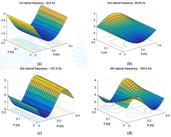 Next, the numerical model of the considered structure was divided into 435 elements with the help of the meshing procedure. This leads to obtaining a singular finite element of the size of 25 mm and 12.5 mm, which corresponds with the half-size of the piezo-actuator. As the result of such discretization, the eigenvalue problem of the plate is solved and their results are shown in Figure 2.