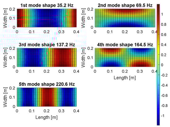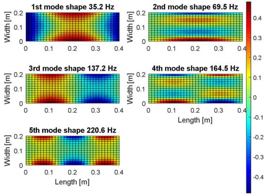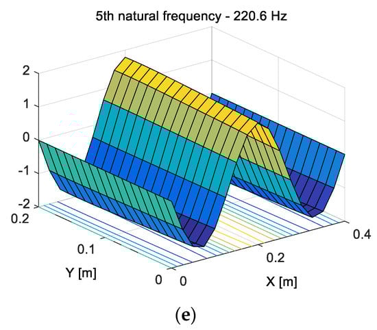 Taking into account Figure 2, it can be seen that the fundamental analytical natural frequency of the smart plate is 35.2 Hz and the corresponding mode shape is in-phase on the overall surface with the maximum deflection placed at the half-length of this structure (see Figure 2a). Higher mode shapes have several in-phase and out-of-phase regions across the surface of the plate. For instance, the second mode (n = 2, f2 = 69.5 Hz) has one node line at the center of the Y axis, the third mode (f3 = 137.2 Hz) has also one node line at the center, whereas in the X direction, the fifth mode (f5 = 220.6 Hz) has two node lines located longitudinally to the Y axis. The fourth mode (f4 = 164.5 Hz), where the nodal lines are located at the center of the plate in both directions X and Y, respectively, is a completely different case.
