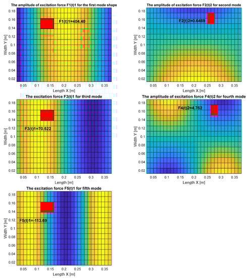 For this purpose, the calculations of the modal excitation force for chosen locations of piezo-actuators on the surface of the plate (see red rectangular in Figure 5 were carried out using Matlab and Ansys. Each time, it was assumed that the voltage applied to piezo-actuators electrodes had constant values that equaled 180 V. As a result, significant unit forces appeared in the indicated placement of the piezo-actuator.