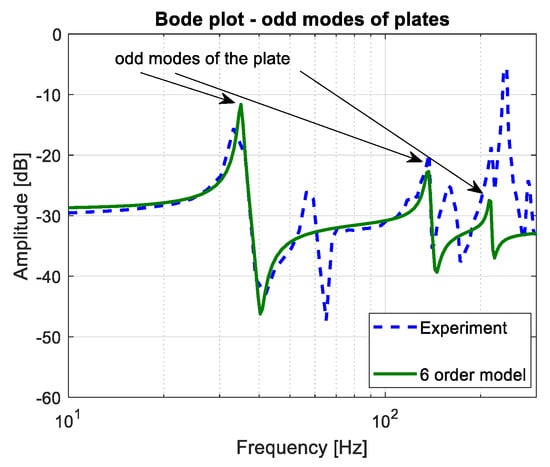 The damping vibrations coefficient was the last parameter needed to calculate the modal voltage. Its value was estimated on the basis of investigations performed for chosen piezo-actuator locations and described in paper [31]. Taking into account the identification procedure of the host plate with integrated piezo-elements, the mathematical model represented only by the odd modes is determined in the frequency range of 10–300 Hz. The obtained in Equation (27) reduced order model, that describes the transfer between the displacement and the force of the plate, is compared with an experimental plot recorded by using an analyzer (see Figure 6). In the results of the comparison of both magnitude plots (reduced order model and FRF), a good compatibility between them is achieved and the values of particular modal damping are obtained: ζ1 = 0.01, ζ3 = 0.005, ζ5 = 0.0007.