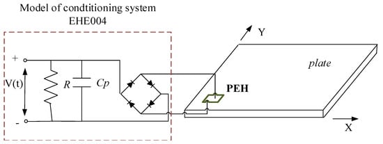 In this section, a standard AC-DC problem of an energy harvesting system for the mechanical model and also for a real structure is solved by connecting a full-wave rectifier with a smoothing capacitor (Cp) and a resistive load (R) to the harvester. Figure 7 illustrates this connection. The AC-DC parameters model used in the simulation were assumed according to the datasheet of the EHE004 conditioning system that was used in the experimental set-up. As a result, the resistive load R equals 100 kΩ, while the smoothing capacitor Cp—100 μF.