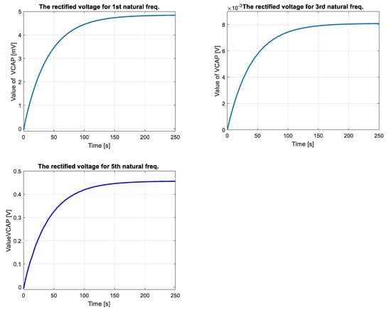 The rectified voltage from a full bridge rectifier with a smoothing capacitor Cp = 400 μF and resistive load R = 100 kΩ obtained for the SFSF smart plate excited to vibration with the first three odd lowest natural frequencies.