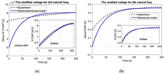 The obtained experimental plots also showed that the process of discharge of the filter capacitor Cp was too short. As a result, it led to obtain two different offset values of DC voltages 6.2 mV for 3rd mode and 0.2 V for 5th mode, respectively. Taking into account this behavior, the voltage response of electromechanical model have been again calculated. For this purpose, two DC voltages of the model have been shifted up to offset value, while amplitudes of AC voltage given by Equation (26) have been calculated for lower values of damping coefficients. As a result, both responses of EH system and the electromechanical model have been adjusted to each other as it is shown in Figure 10 (see shifted plots).
