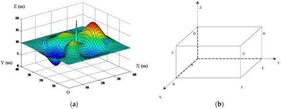 In this paper, each terrain has the same size (40 m × 40 m × 20 m). We assume that the length and width of the robot are less than 1 m, the unit grid will be 1 m per side on the plane XOY, and 0.5 m as the unit height along the Z-axis. Thus, the grid division is 40 × 40 × 40 in the direction of X-axis, Y-axis, and Z-axis. We set the height of the robot’s obstacle crossing to one unit of grid length (0.5 m), the coordinate difference on the Z-axis between the robot’s current position and its next position is no more than one unit length (), which means that robots do not have the ability to raise or drop more than 0.5 m in one step.