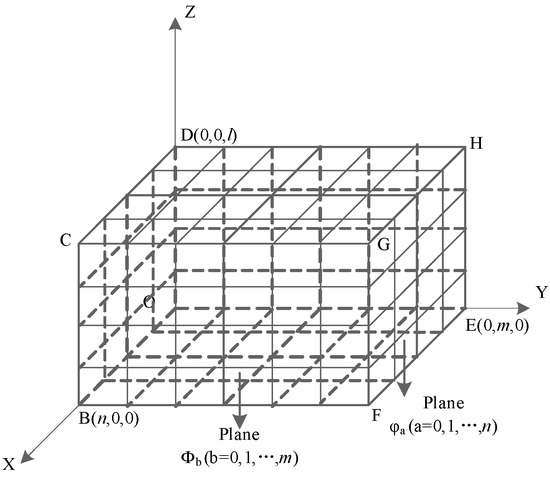 After obtaining the planning space, we will conduct further division. Firstly, we divide OBCD-EFGH to m equal parts along Y-axis and create planes parallel to OBCD over every equal-part point, by which we obtain m + 1 planes, . Then we divide plane to n parts along the X-axis and l parts along the Z-axis, by which the planning space will be dispersed to cubes, as shown in Figure 2. In practical application, the selection of m and n should be in terms of the free movement of the robot in a unit grid. As a division of the height, l should be selected in terms of the climbing ability of robot. Confirming the values of m, n, and l should also give consideration to the storage of environmental information and the accuracy of path planning.