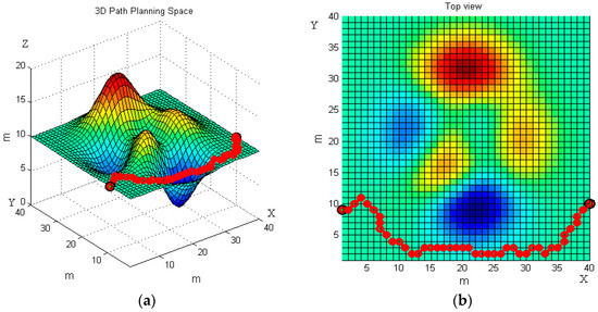 The robot’s moving trajectory using the improved ant colony algorithm in the first terrain. (a) Front view; and (b) top view.