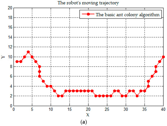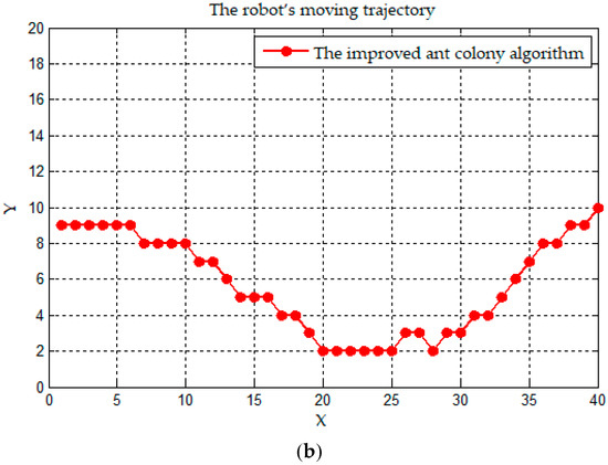 Figure 9a is the robot’s moving trajectory of the basic ant colony algorithm, and Figure 9b is that of the improved ant colony algorithm. According to the definition of path trajectory in [39], the two trajectories are continuous and uninterrupted, so they satisfy condition . Both trajectories have inflection points, which we usually call non-derivable points, and neither trajectory satisfies the condition. As the number of inflection points in Figure 9a is more than that in Figure 9b, the trajectory of the improved ant colony algorithm is smoother than that of the basic ant colony algorithm.