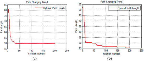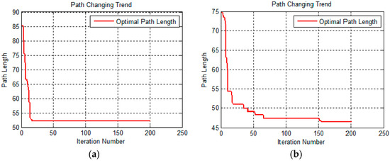 We also compared the relationship between the optimal path length and the number of iterations. The results are shown in Figure 10.