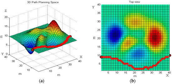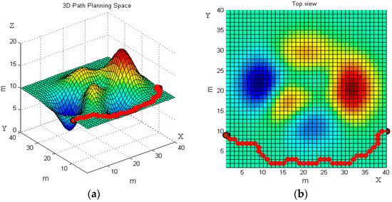 Equation (5) represents the pheromone concentration of discrete points in the 3D environment, and indicates the pheromone update coefficient. In Equation (6), indicates a path length set searched by ant g (g = 1, 2, …, r), and K is a constant.