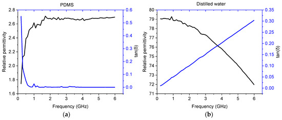 Dielectric properties of the materials measured with Dielectric Assessment Kit (DAK) and used in model: (a) polymethylsiloxane (PDMS); (b) distilled water.