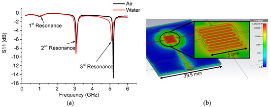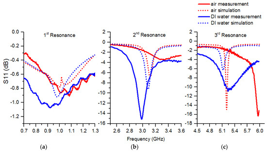 Compared to the simulation, the measurements showed a larger variation in frequency at all three resonances. The simulation and measured results with air and pure water are shown in Figure 8, and Table 2 includes information about all three resonances and the total change between the air and water samples.
