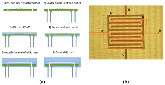 (a) Sensor processing steps; (b) sensor dimensions (a = 0.25, b = 4.75, and c = 5 mm) and highlighted fluidic channel as orange line.