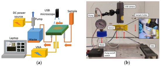Measurement and sample pumping system: (a) schematic presentation (b) photograph of the system (the computer and voltage source are not shown).