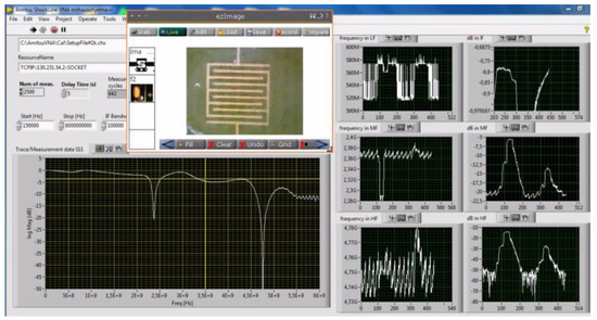 Microwave measurements were performed using a one-port vector network analyzer (Anritsu MS46121B) and the instrument was controlled automatically with tailored LabView software. S11 data over the whole spectrum were saved at 10 s intervals. Moreover, peak data (attenuation minimum and frequency) were saved and plotted in real time. The frequency sweep was from 150 kHz to 6 GHz with 1993 points. Before running the experiments, the VNA was calibrated using open-short-load calibration. Figure 7 shows the software user interface.
