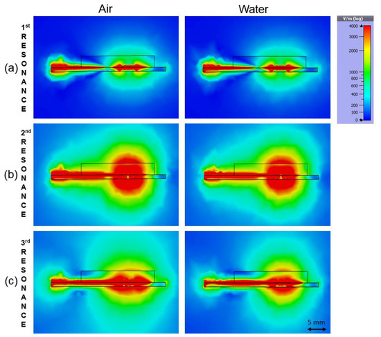 Simulated radiation patterns in three different resonances: (a) 1st resonance with air and with water; (b) 2nd resonance; (c) 3rd resonance where air shows higher radiation to surrounding space.