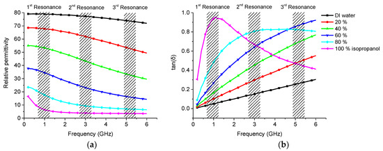 In the sensor measurement, the first resonance (Figure 11a) showed higher attenuation as the isopropanol content rose which was caused mainly by a higher loss factor (Figure 10b). Moreover, there was a slight shift towards higher frequencies, which was caused by the lower effective permittivity.