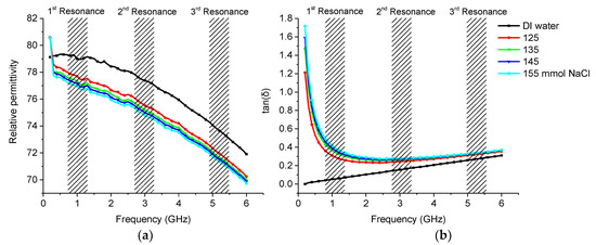 Permittivity and losses of saline water measured with DAK system: (a) Permittivity; (b) Loss tangent.