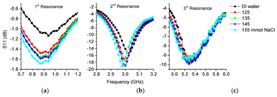 The sensor clearly showed higher attenuation on the first resonance peak, see Figure 13a, as the loss tan increased with the salinity. The second frequency, see Figure 13b, also showed higher attenuation as the salinity increased. At higher frequency, see Figure 13c, the response was not observed clearly due the small changes in the losses between samples with different salt concentrations.