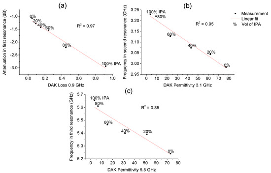 Isopropanol measurements versus DAK measurements: (a) first resonance vs. loss tangent; (b) second resonance vs. relative permittivity; (c) third resonance vs. relative permittivity.