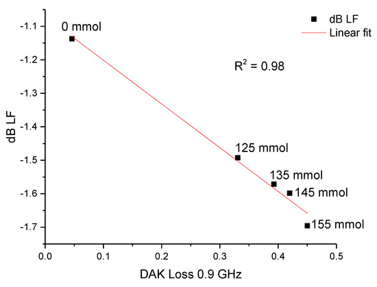 DAK measurements showed that the relative permittivity was lower with saline water compared to distilled water. Results can be seen in Figure 12a. However, a higher permittivity at a frequency of 200 MHz was also seen due to the ions having time to cause polarization of the liquid medium and thus causing a higher relative permittivity. Saline in water causes higher losses compared to pure water due to the increasing conductivity as there are free ions present. Ions cause absorption of the electromagnetic wave, which can be seen clearly on the DAK measurements shown in Figure 12b, but this phenomenon disappears at higher frequencies.