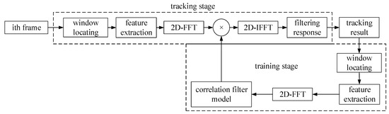 A schematic diagram of KCF. The whole process is divided into two steps: training and tracking. After updating the correlation filter model by the tracking on the last frame, the model can get the tracking result on the current frame. FFT and IFFT respectively denote the Fast Fourier Transform and the Inverse Fast Fourier Transform.