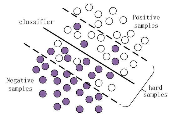 The relationship between classification hyperplane and samples. The white circles and the dark circles separately indicate the positive samples and the negative samples. The samples inside the dotted line are the hard samples which will not be classified correctly.