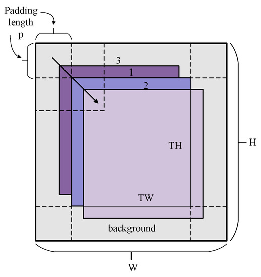are the offsets alongside the horizontal axis and vertical axis. It is obvious from Figure 3 that the top left vertex of the target frame just slips over the range , and the bottom right vertex of the target frame just slips over the range . Circular convolution in this range can avoid the segmentation of target samples. In addition, there is a strong correlation between the base sample and the shifting samples close to it, which belongs to the hard samples to be mined.