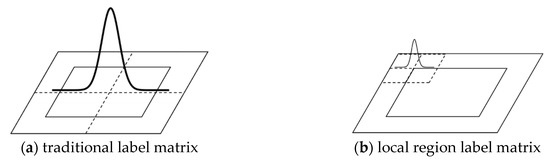 The comparison between the two-dimensional labels of traditional circular samples and local region circular samples in time domain is shown in Figure 4. The labels in Figure 4a are generated for the whole searching area, while the labels in Figure 4b only considers the correlations of local regions. According to the property of DFT, when two-dimensional label and the self-correlation matrix are transformed from time domain to frequency domain, the high frequency component will move to the origin. Only the matrix elements in the range are considered in the frequency domain. Therefore, the self-correlation kernel matrix and the parameter matrix of the model are greatly reduced.