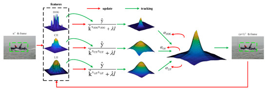 The proposed model based on adaptive multi-feature fusion is described in Figure 5. The red arrows indicate that the model parameters are updated according to the predicted results of the current frame. The green arrows indicate that the filtering in this frame is calculated according to the model updated last time and the input image of this frame. For both color histogram and local binary pattern histogram, a correlation filter model is established respectively. respectively denote the hog feature, color histogram, and local binary pattern histogram. For the same target, the three features are characterized in different fashions, and the filtering responses obtained by the three models are also different. When training the target features in the previous frame, the self-correlation kernel matrix of each feature must be computed first. Then the parameter matrix of each model can be obtained separately. The main model integrates the filtering results of each sub-model and preserves the diversity of each-sub model.