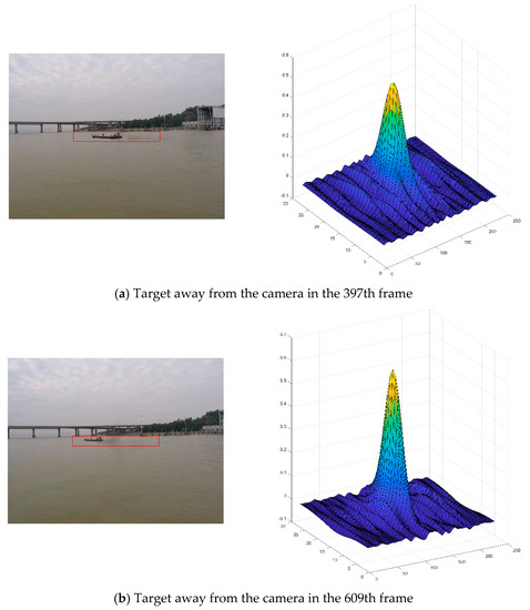 Target away from camera causing loss of target: (a) Target away from the camera in the 397-th frame; (b) Target away from the camera in the 609-th frame. The image on the left is the tracking result of the current frame while the graph on the right is the filtering response of the current frame.
