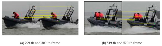 Schematic diagram of matching points based on surf feature in adjacent frames: (a) 299-th and 300-th frame; (b) 519-th and 520-th frame.